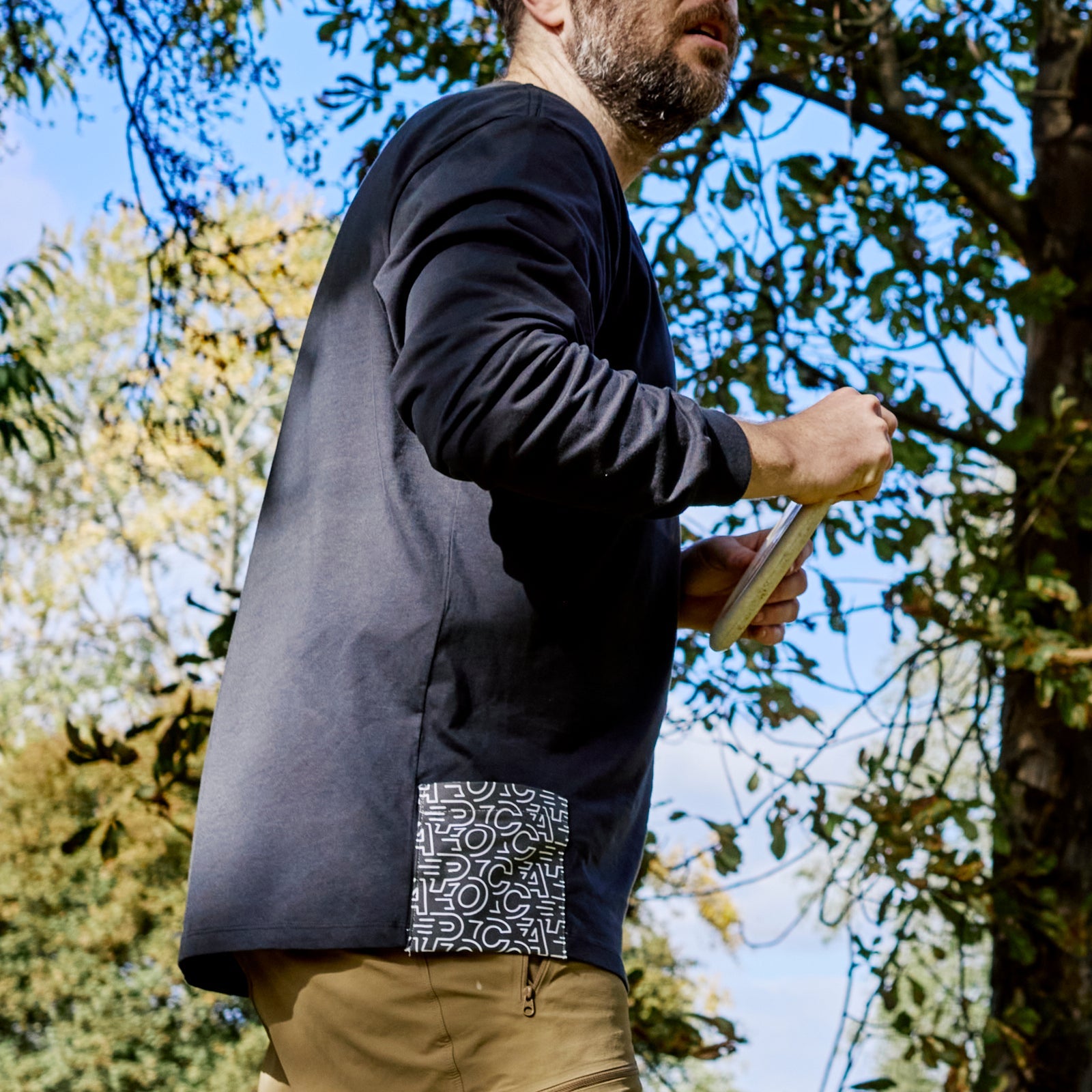 Made from premium organic cotton, this long sleeve casual t-shirt comes in two colours: olive black and bone. It features a specially designed pocket that can be positioned on either hip, depending on your throwing arm. We recommend placing the pocket on your dominant side. Right side for right-handed players, left side for left-handed players.